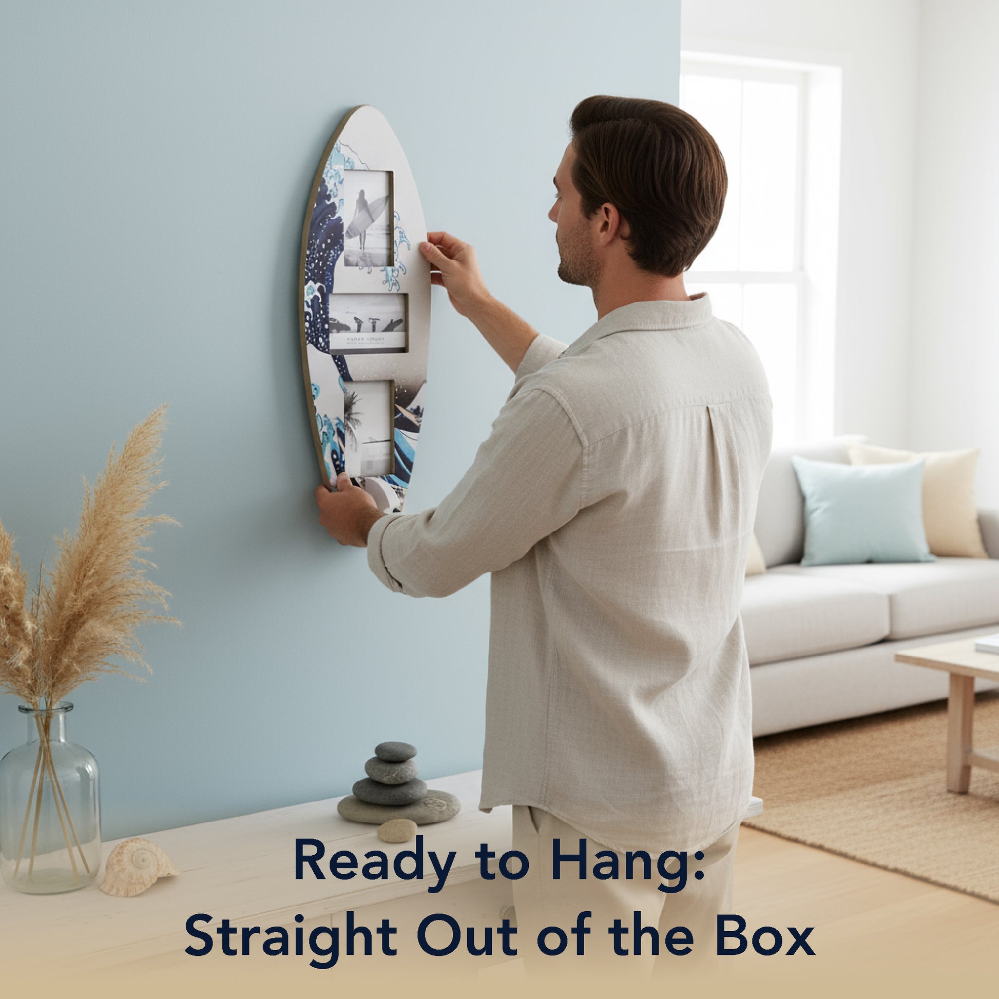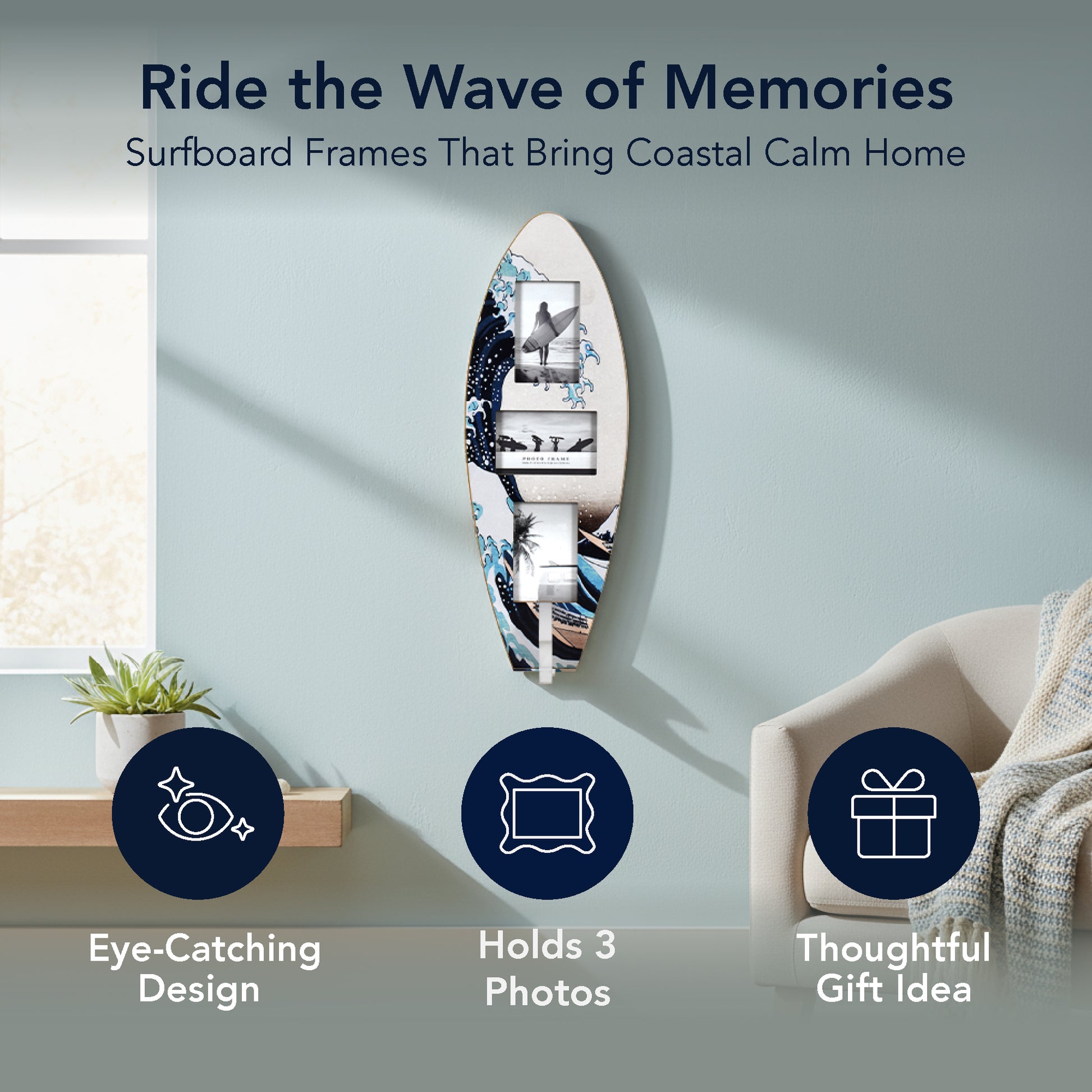 - BEACHY GALLERY IN ONE SURFBOARD FRAME - Instead of separate frames, this surfboard-shaped collage holds 3 horizontal photos in a vertical surfboard design-great for showcasing beach memories in a compact, decorative wall art piece.