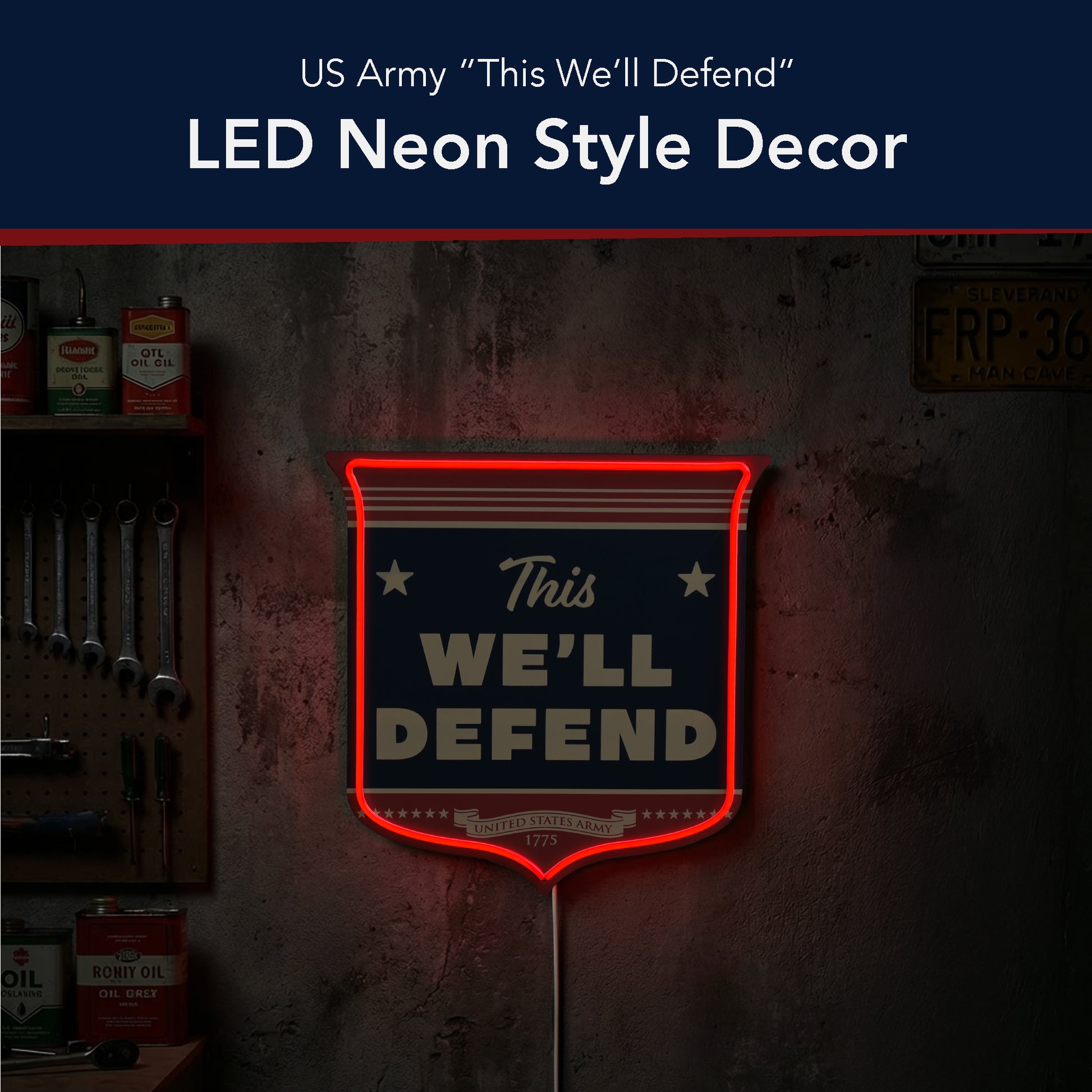 The shield-shaped design features the iconic “This We’ll Defend” motto framed by stars, heritage typography, and historic detailing referencing United States Army - 1775. A built-in red LED light traces the plaque’s outline, creating a neon-style glow that adds dramatic contrast and visual impact without heat, buzzing, or high energy use.