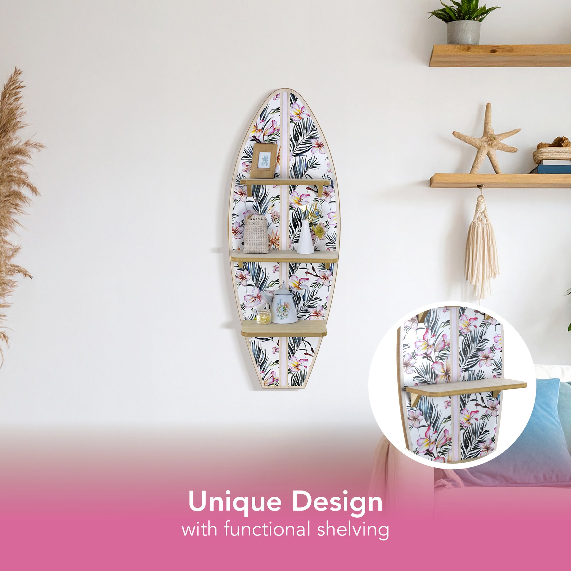 Tropical Surfboard Wall Shelf with Flowers and Palm Leaves