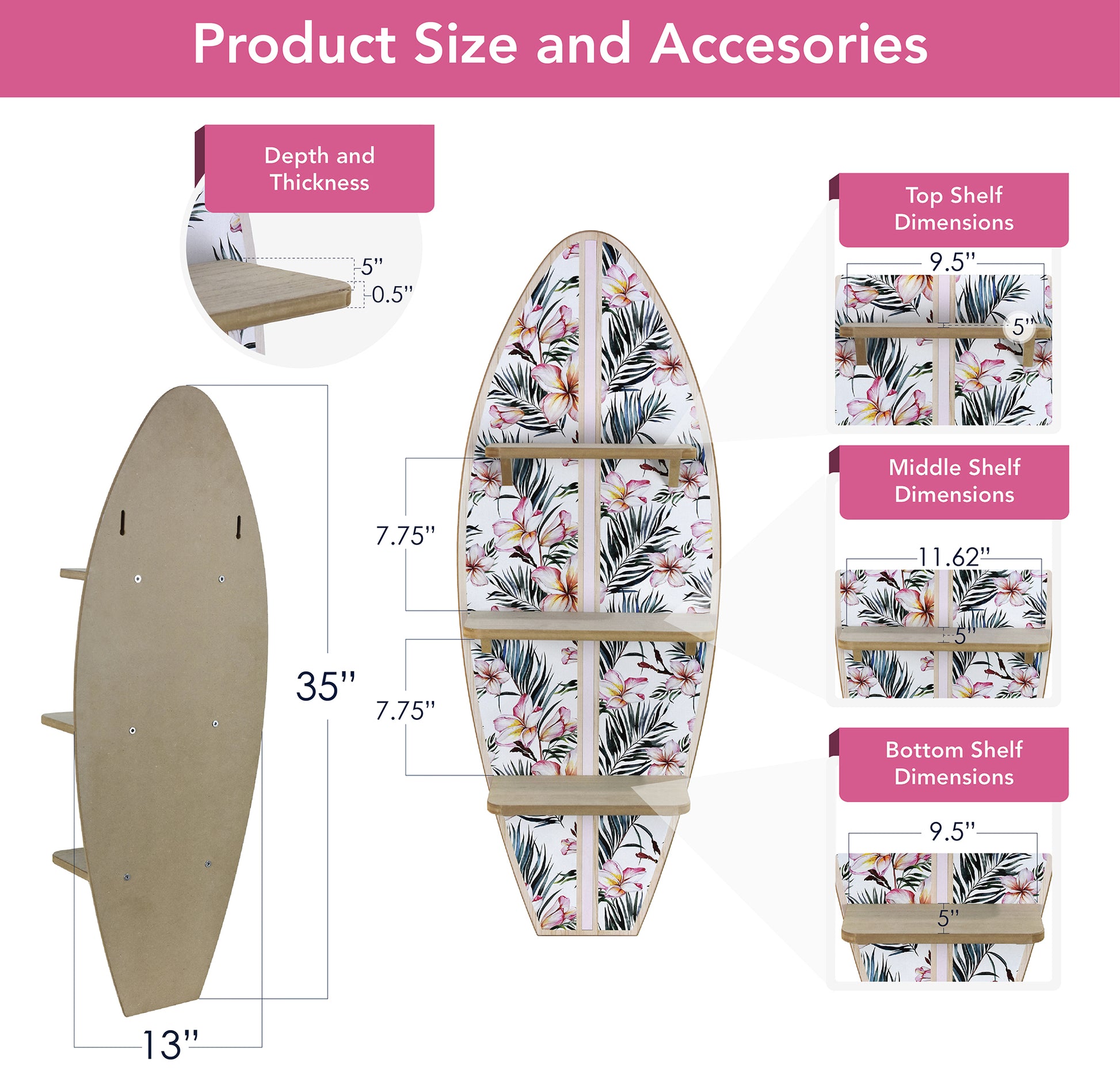 Perfect for adding a pop of color and island-inspired style, this surfboard-shaped wall art fits effortlessly into coastal, boho, beach-themed, or tropical decor aesthetics. Whether you're styling a girls' room, beach house, meditation nook, or relaxed office space, this shelf offers both storage and standout style.