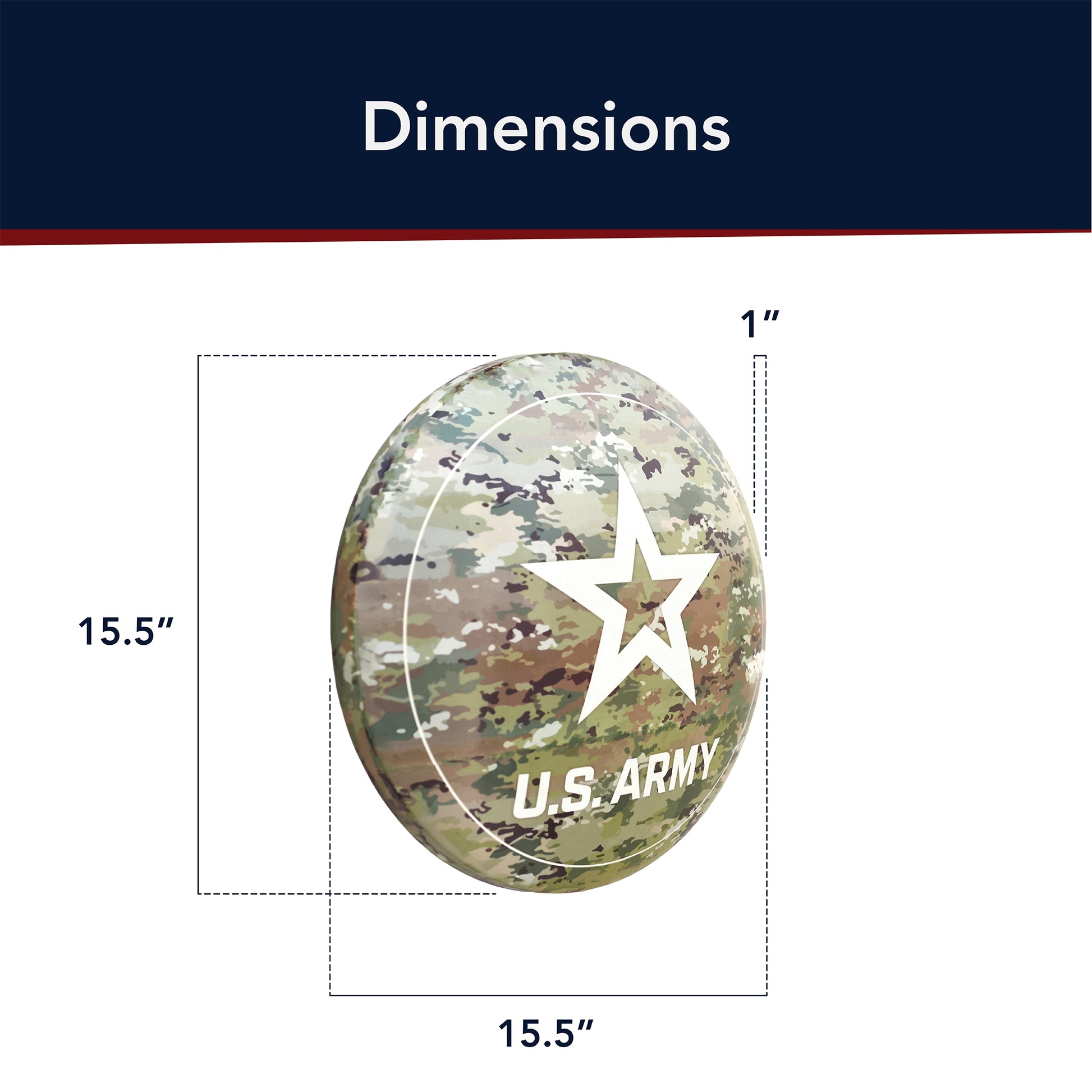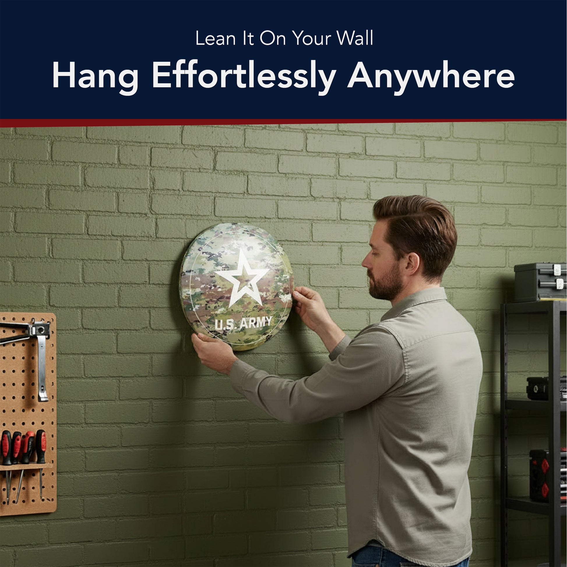 Show pride in service and strength with this U.S. Army Dome Metal Wall Art Sign, a bold 15-inch round metal decor piece designed for veterans, active-duty service members, and patriotic homes. Featuring a classic military star set against an authentic camouflage background, this wall art captures the discipline, honor, and legacy of the U.S. Army.Crafted from durable metal with a raised dome profile, this wall sign delivers dimensional depth and visual impact that stands out from flat metal prints. The rounded silhouette and glossy finish enhance its premium appearance, making it a powerful focal point in garages, man caves, workshops, offices, living rooms, dens, and game rooms.