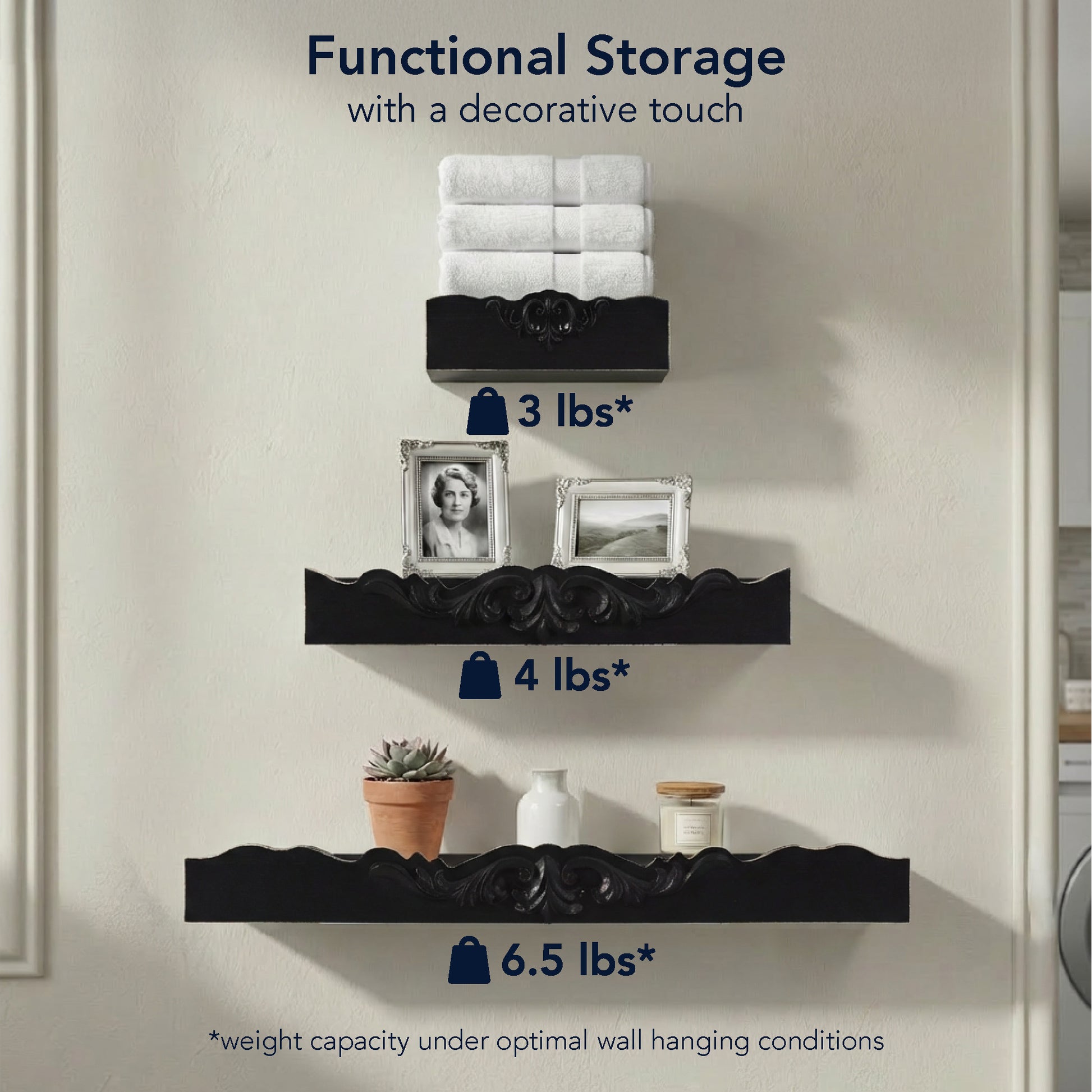 - VERSATILE FLOATING DISPLAY - Use as floating shelves or install directly as wall appliques-ideal for small decor, picture frames, candles, collectibles or as accent moldings.