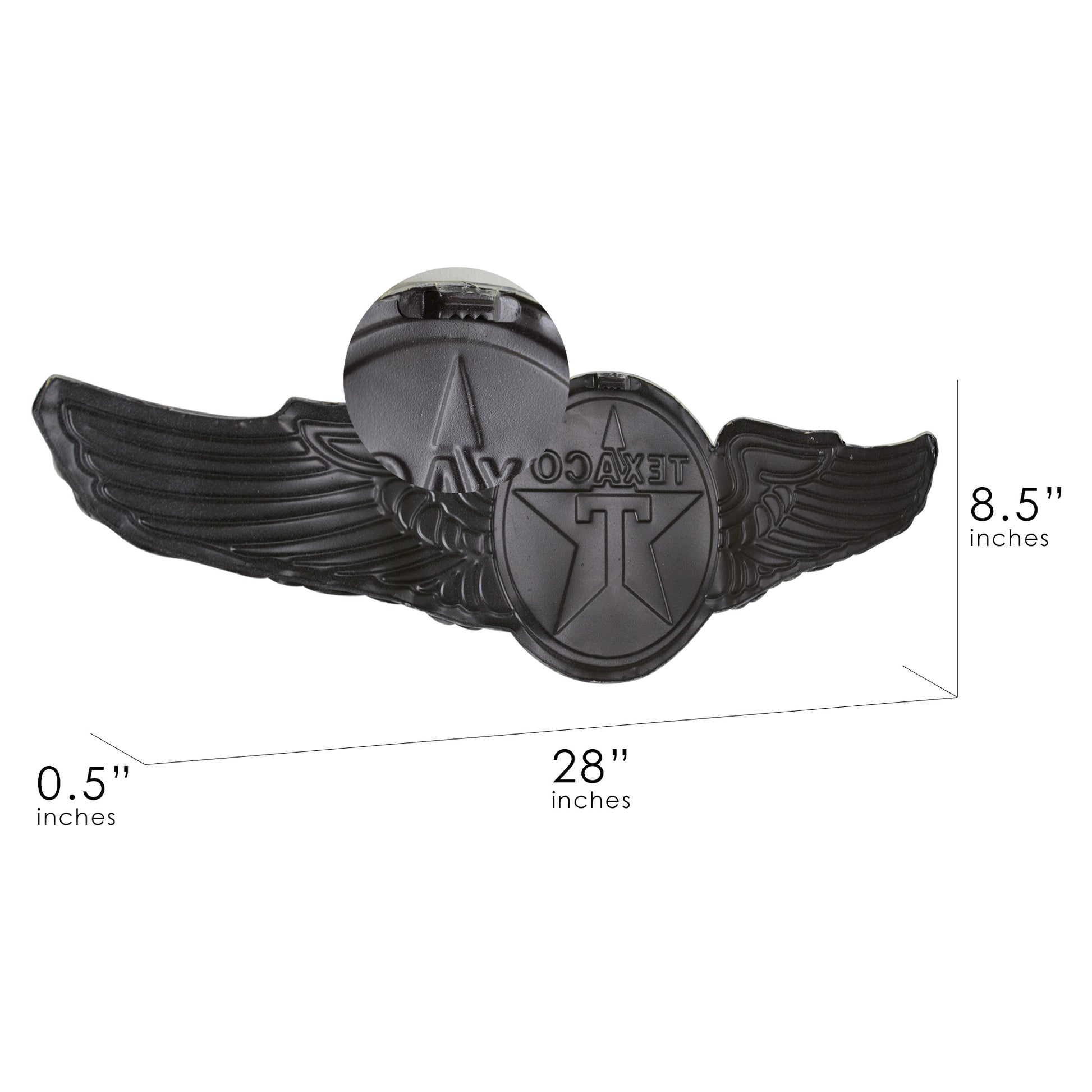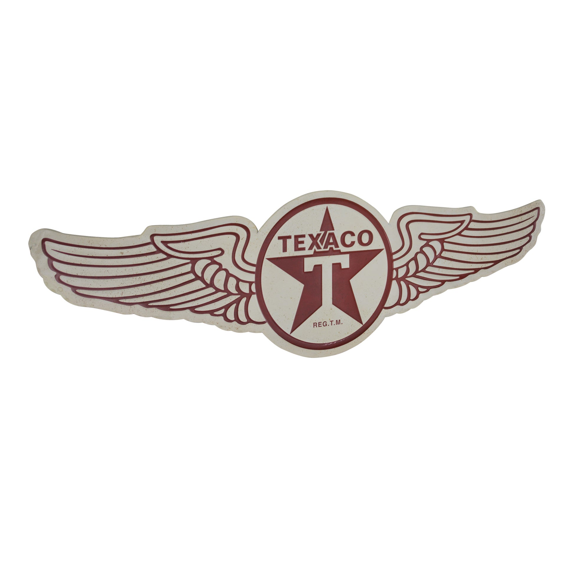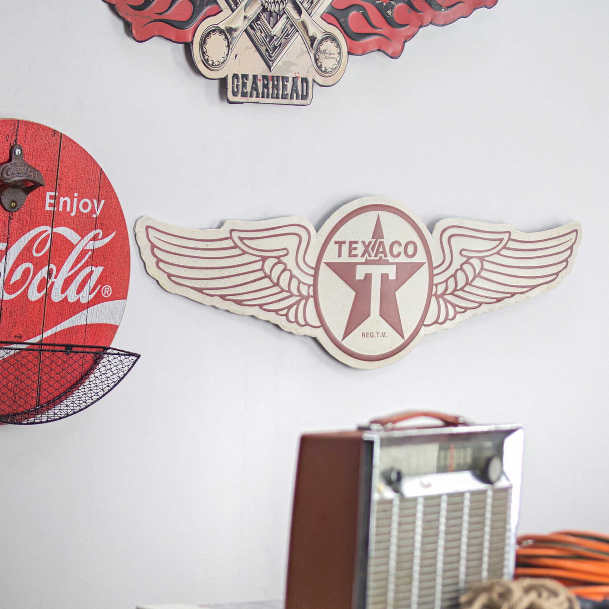 Whether you’re an aficionado of Texaco memorabilia or just really appreciate vintage-inspired signage and decor, this embossed metal Texaco sign features the old-school wings that were popular of the company’s brand from days past.Rendered in the company’s iconic red and white coloring and outfitted with a saw-tooth hanger for easy hanging, this wall decor sign is ready to race into your home and onto your walls. Be it man cave, garage, home bar, or for your collage of vintage signs, this retro Texaco piece is sure to become a great addition to your collection.