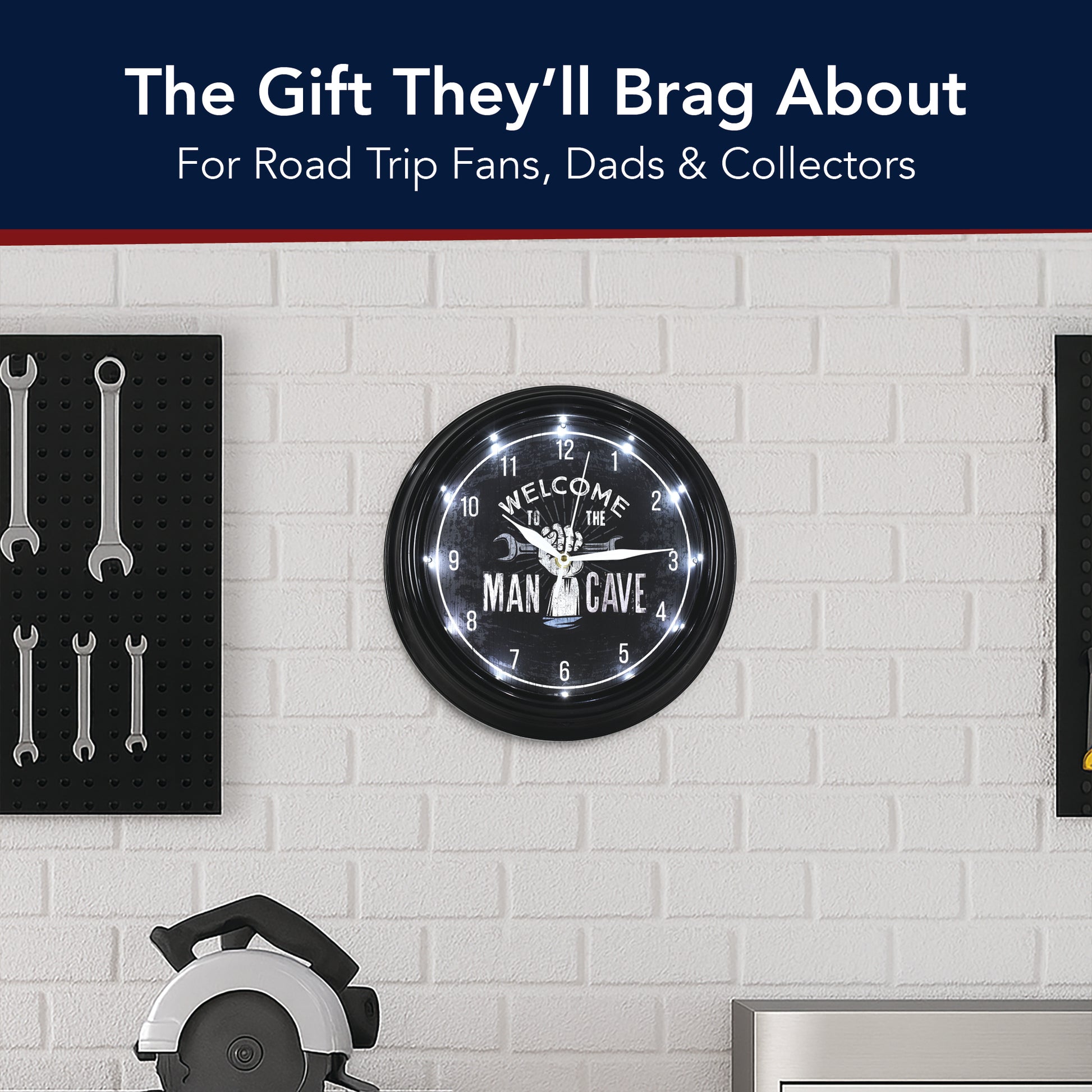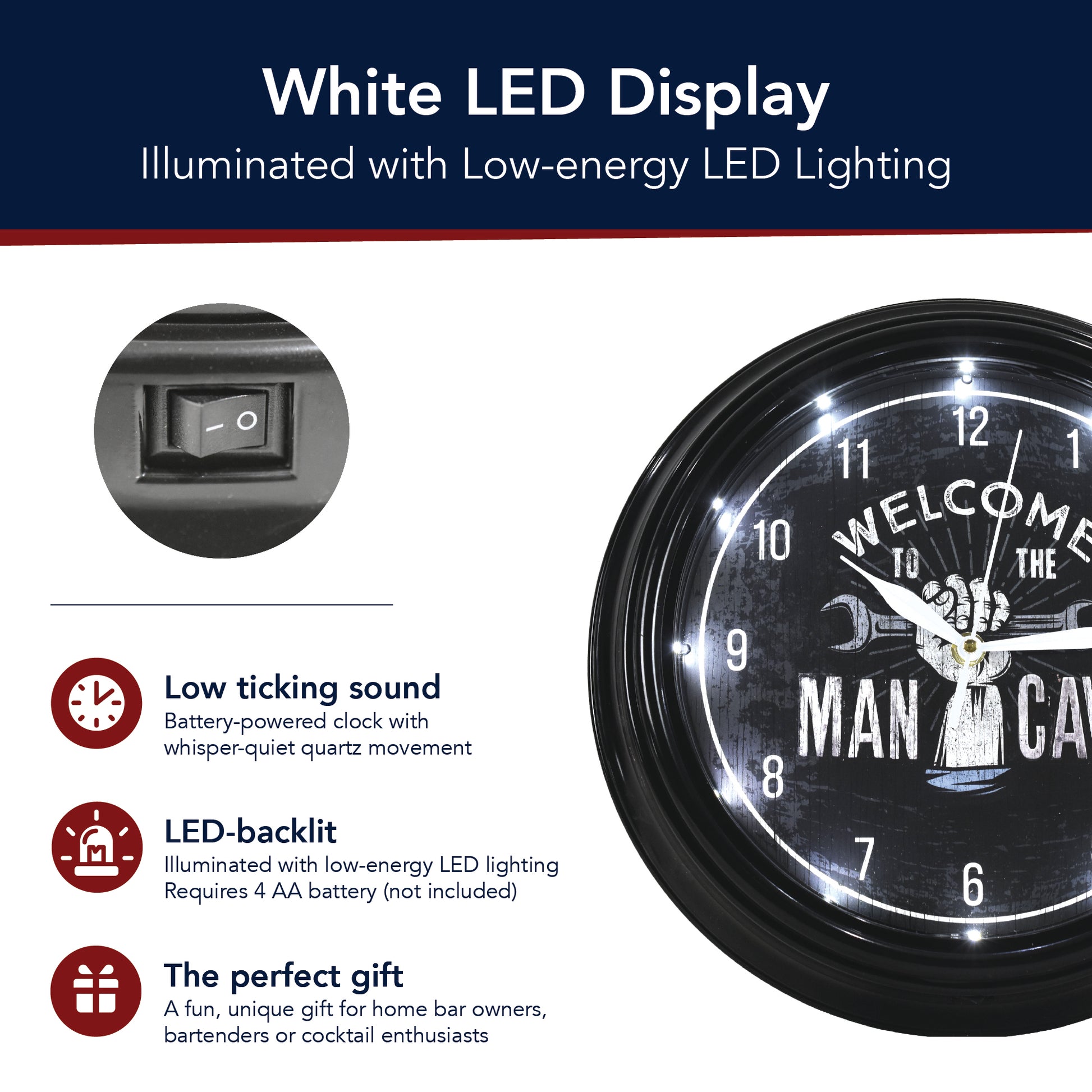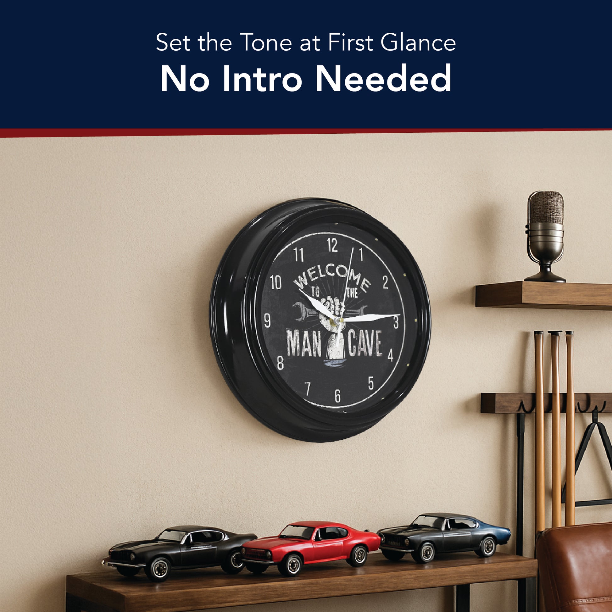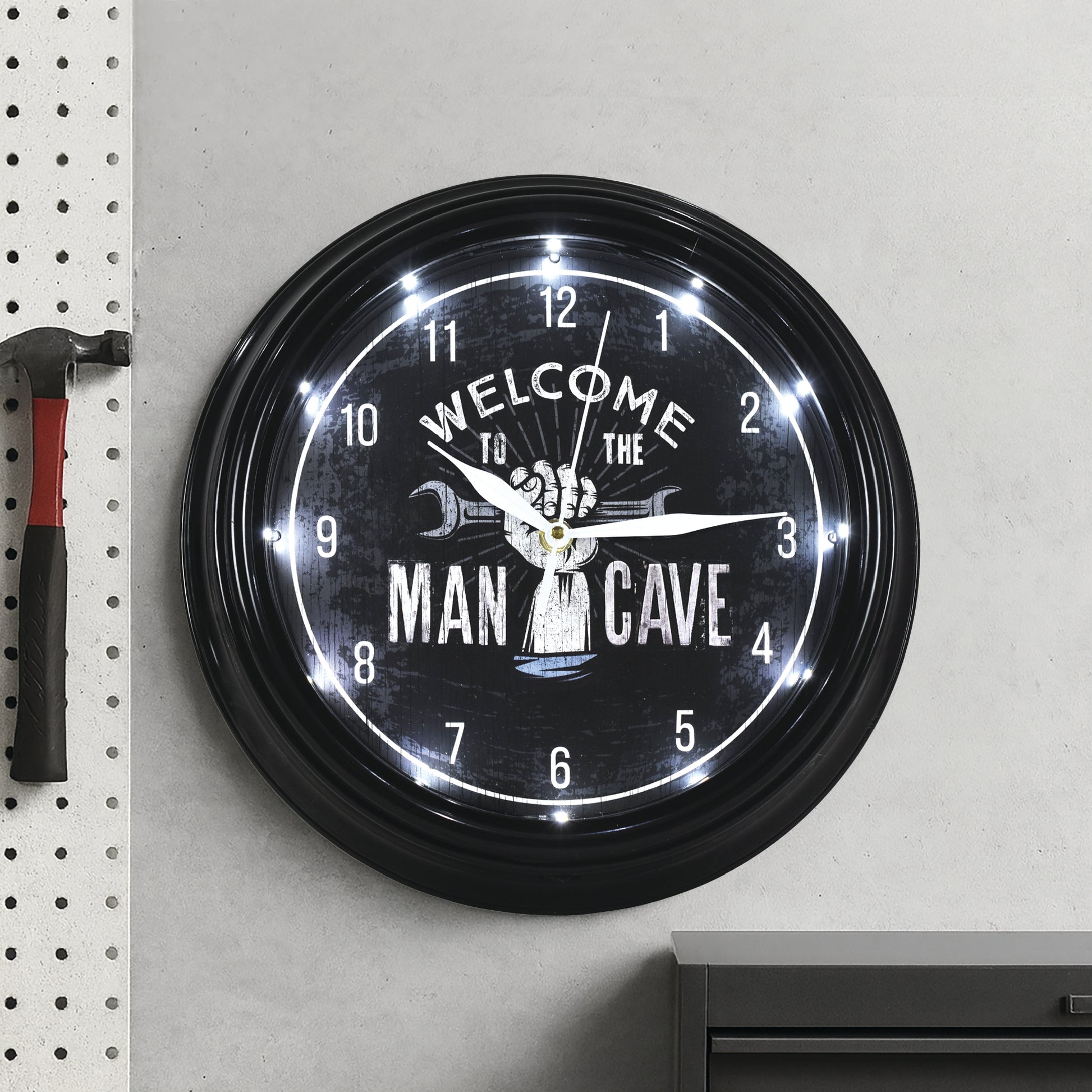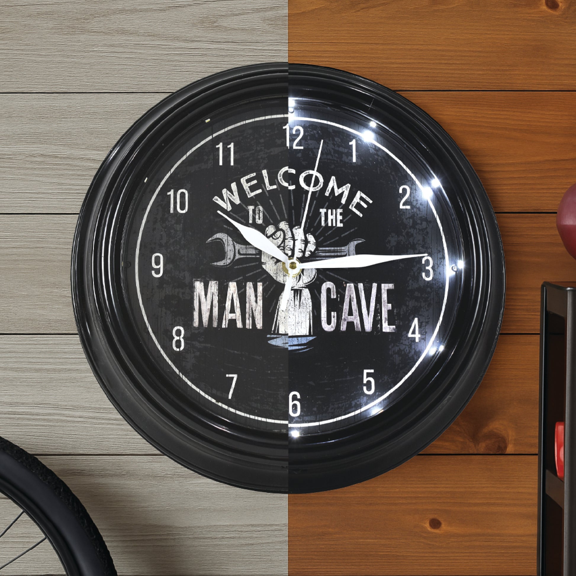 - INSTANT "MAN CAVE" STATEMENT PIECE - 12" LED-accented wall clock that greets guests with "WELCOME TO THE MAN CAVE"; ideal for man cave decor, wall clock for garage or game room-makes a powerful style-first statement that guests instantly recognize.