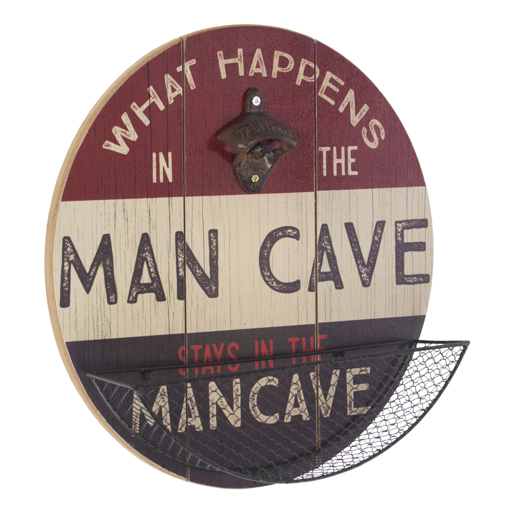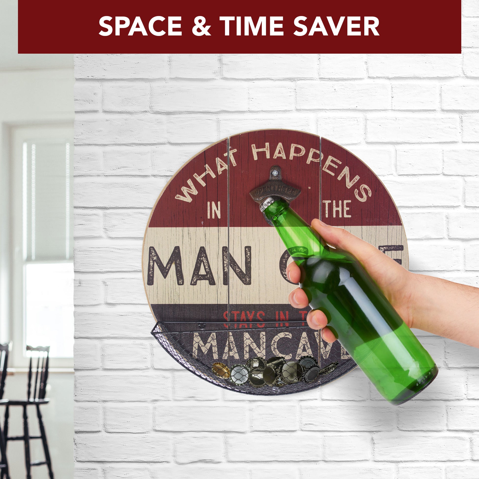 Complete the look for your home bar, man cave or garage with this comical, wall-mounted bottle opener and cap catcher that details printing on wood with large lettering and a weathered and rustic aesthetic that gives the piece a vintage feel.