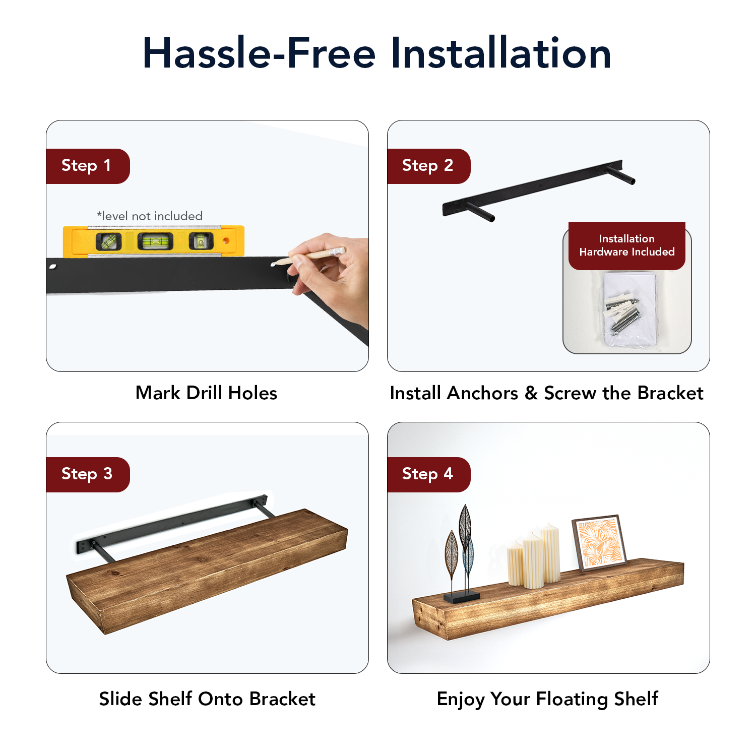 Equipped with a mounting bracket that hides behind the shelf, this rustic shelf is the perfect project for the do-it-yourselfer in your life. With mounting hardware included (drywall anchors and screws), installation requires minimal effort with maximum return. Comes with mounting bracket, drywall anchors and screws