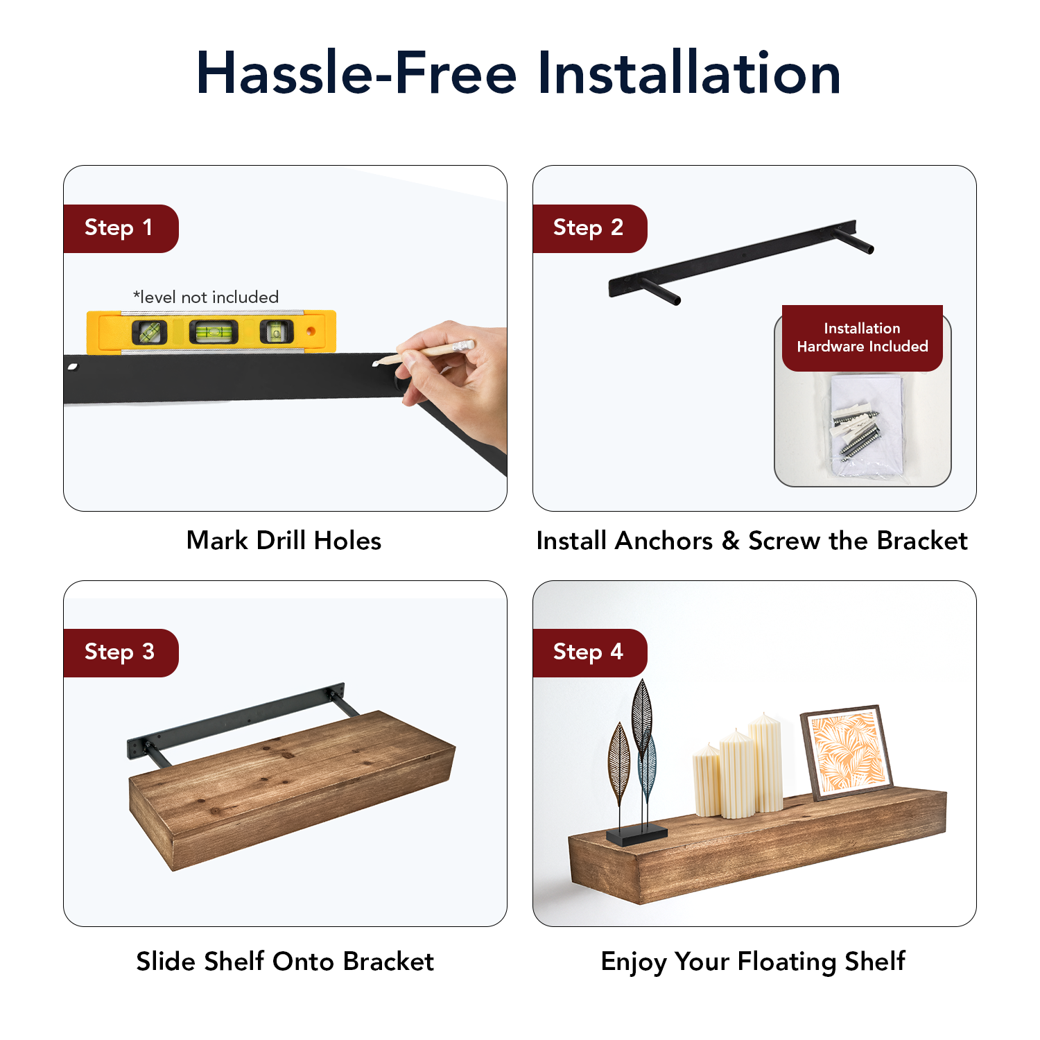 - READY TO HANG – Fully equipped with a mounting bracket, drywall anchors and screws, this floating shelf also includes instructions for hanging.