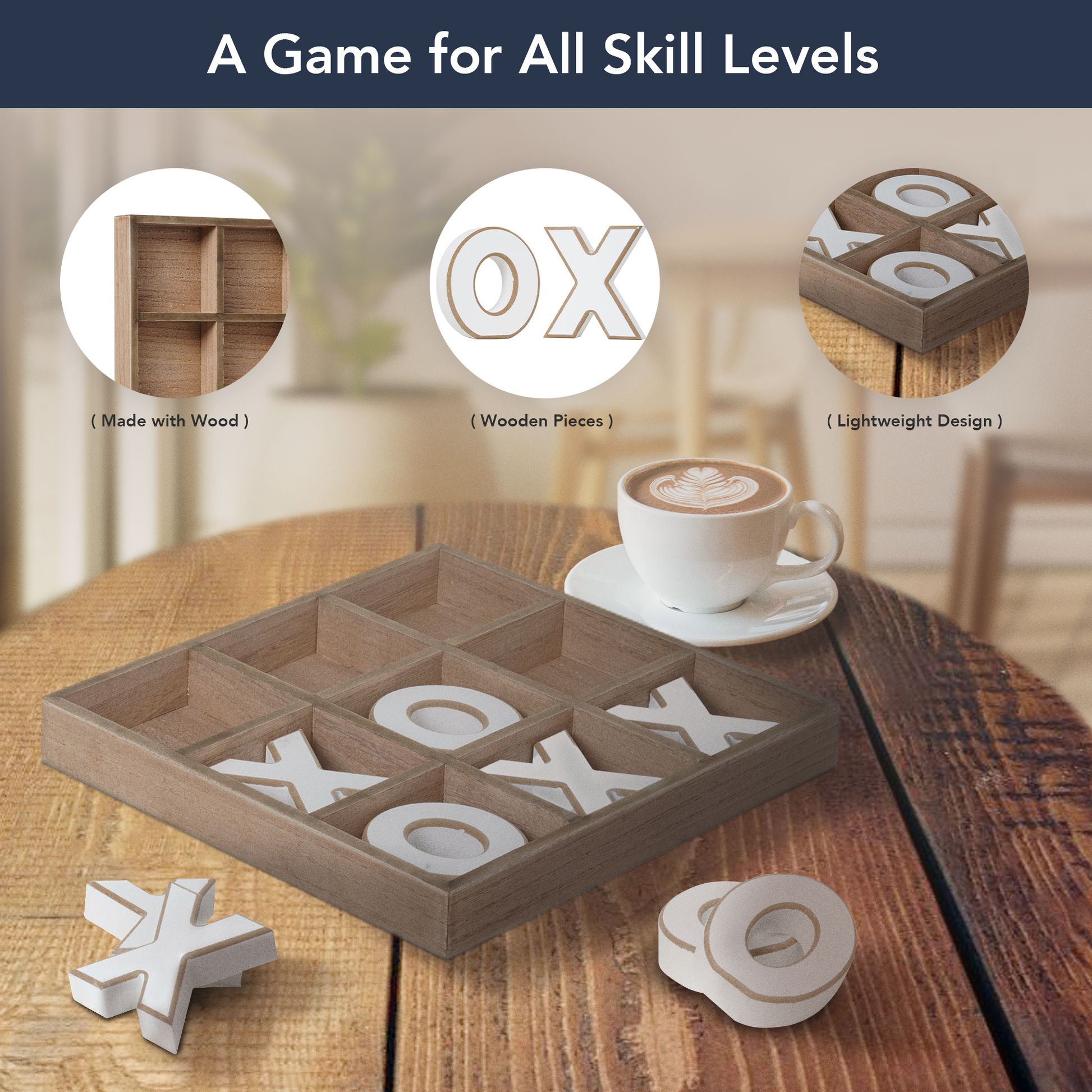 - CLASSIC TIC TAC TOE GAME - Host an entertaining game night with this farmhouse-style version of a classic game favorite. Outsmart your opponent with large wooden Xes and Oes playing pieces that fit snuggly into compartments on a wooden game board.